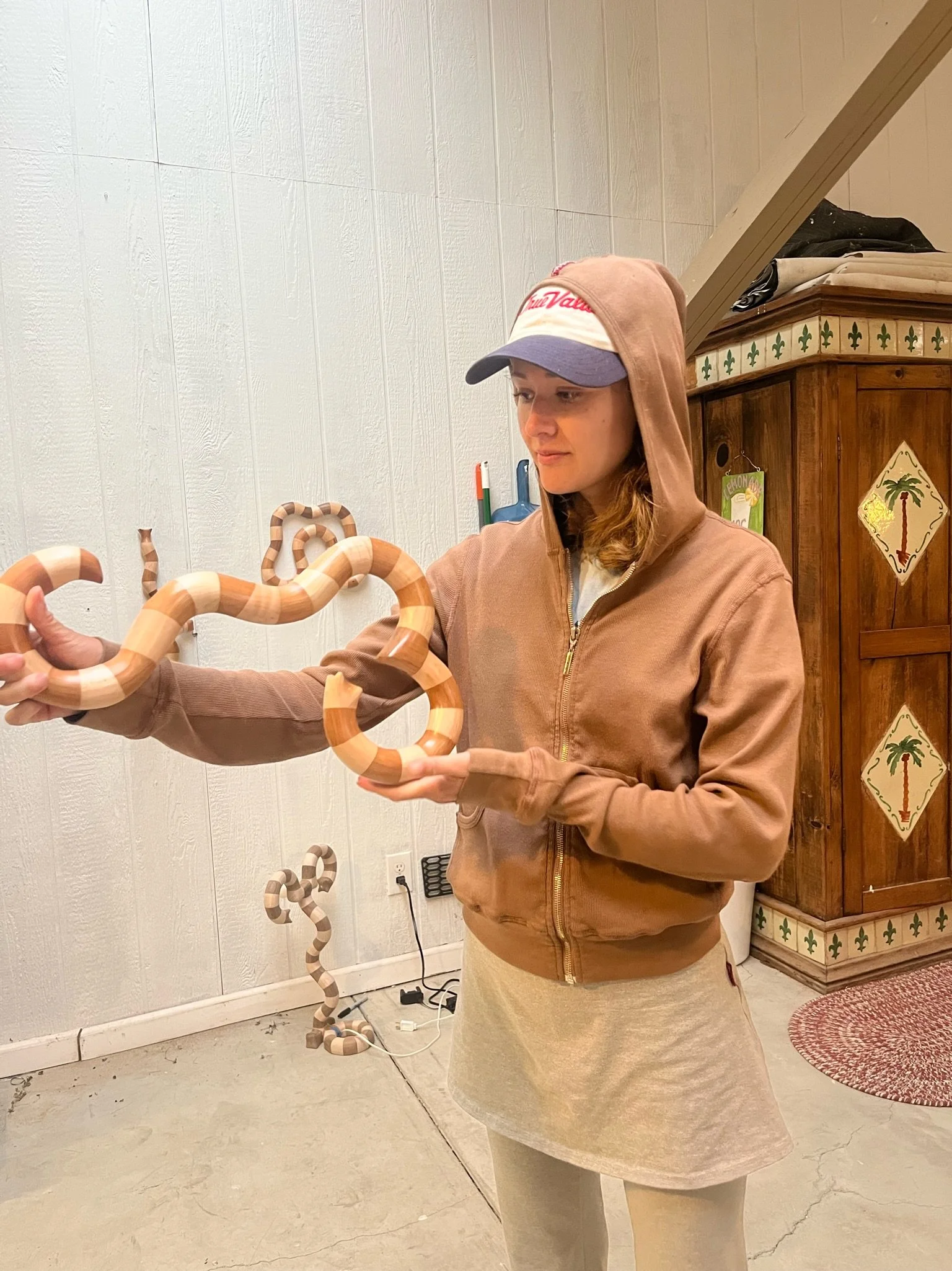 Hi im Lauren, an artist and designer specializing in segmented wood sculptures and objects. Departing from traditional segmented woodturning, I use a process in which wood segments accumulate into spiraling, curling shapes and forms. This method is an exercise of infinite play- a live 3D sketch of rearranging, adding, and removing angled segments until a final form is intuitively found. Each piece is one of a kind; my work is iterative and process-based, with one sculpture often inspiring the next.